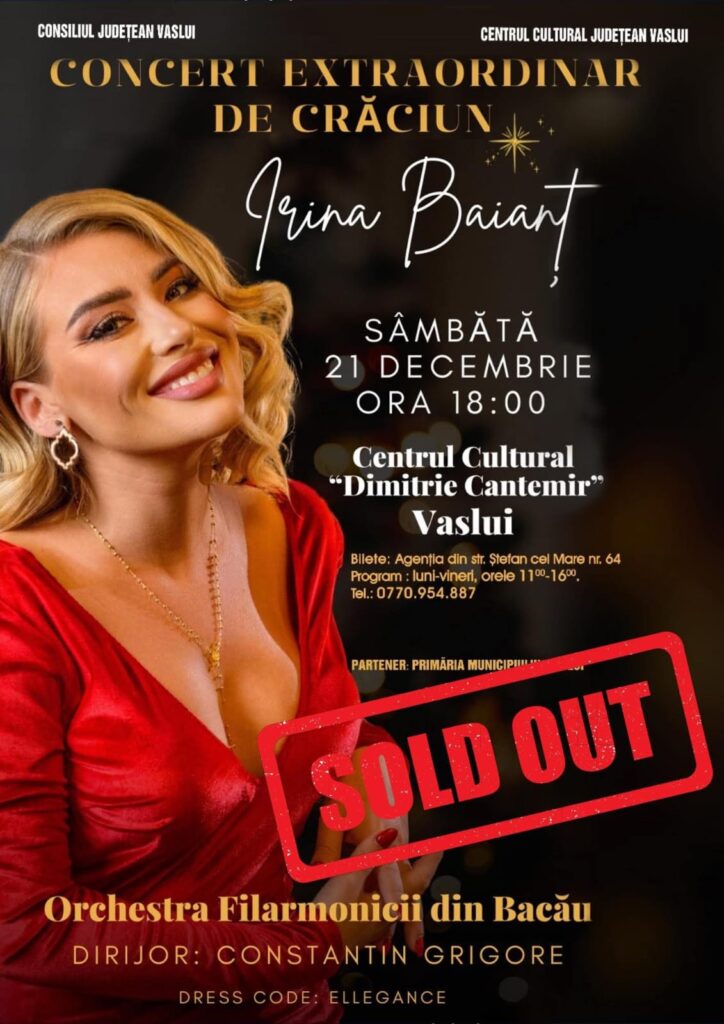 Pe 21 decembrie, de la ora 18:00, vă invităm la un adevărat regal muzical. La Centrul Cultural „Dimitrie Cantemir” va avea loc Concertul Extraordinar de Crăciun susținut de Orchestra Filarmonicii din Bacău, invitatul special al serii este celebra soprană, Irina Baianț.