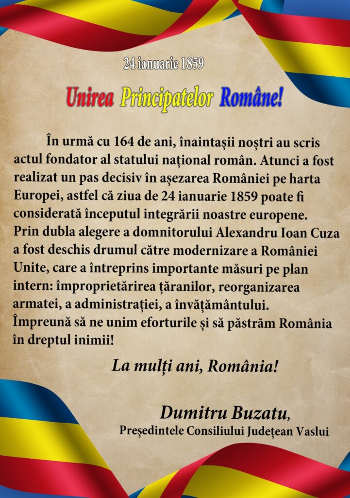 În urmă cu 164 de ani, înaintașii noștri au scris actul fondator al statului național român. Atunci a fost realizat un pas decisiv în așezarea României pe harta Europei, astfel că ziua de 24 ianuarie 1859 poate fi considerată începutul integrării noastre europene.